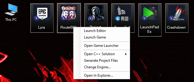 All of the actions you need for development are right at your fingertips. UEDesktop support quick launching of the editor or game. You can generate project files, open the project in Visual Studio or even change which version of the engine your project is assocated with.